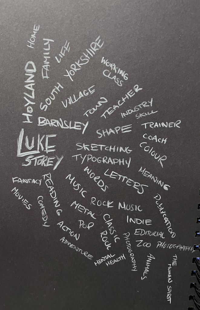 I started with a simple word reflection by trying to answer all four of the questions in one simple design form. This allowed me to think about myself as a person and as a designer. These four things stood out to me: I live in Barnsley. I’m a teacher and a practitioner of design. I am a lover of music and I am a lover of typography.