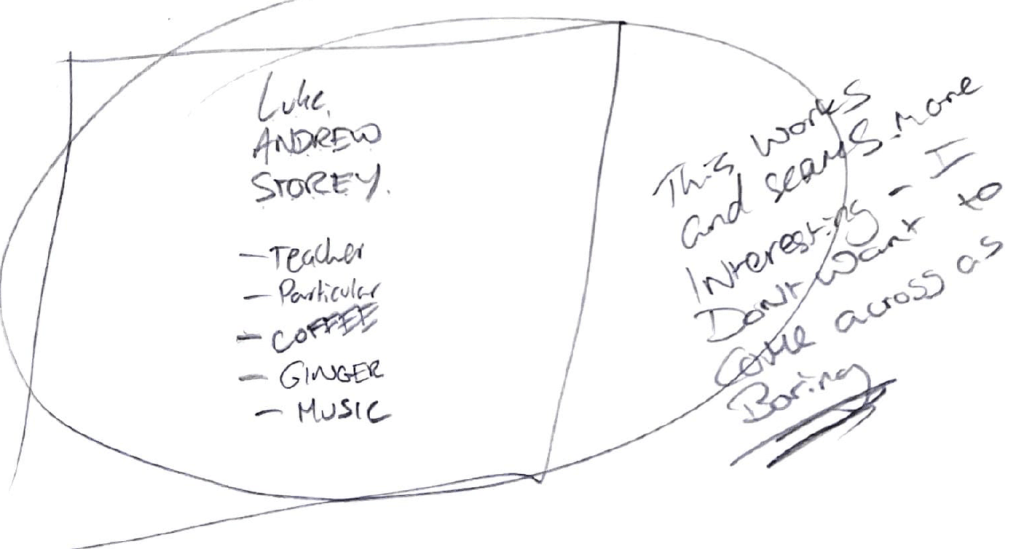 After completing this first concept, I decided I wanted to go back to the drawing board. I felt like I needed more impartialness within my design and that I needed to see this from the perspective of someone else. It was at this point, this struck me to include my friends within my work. One of the main issues with the initial concept was that I needed to include something that was less boring, which (I am hoping they would never think that I am boring) is why I am friends with them. So I sent the message: Tell me about Luke Storey?