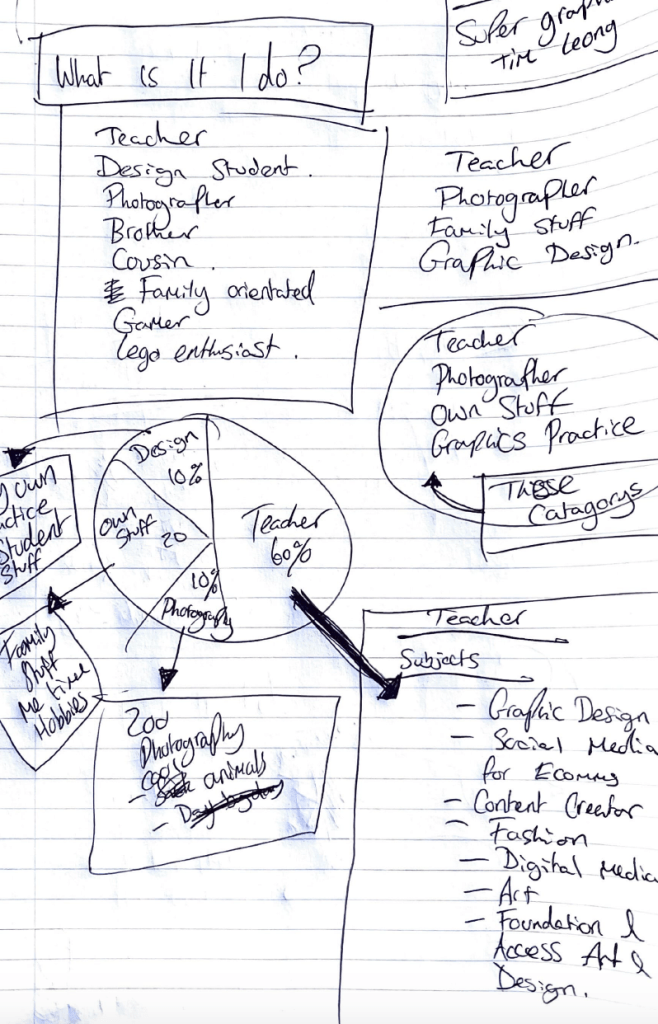 What I have done here is started to produce a list of the most frequent things that I do in my life. I then broke this down into more generalised categories. This allows me to then think about how I can expand on each point. These general categories include: Teacher, Photographer, Own Stuff and Own Practice.