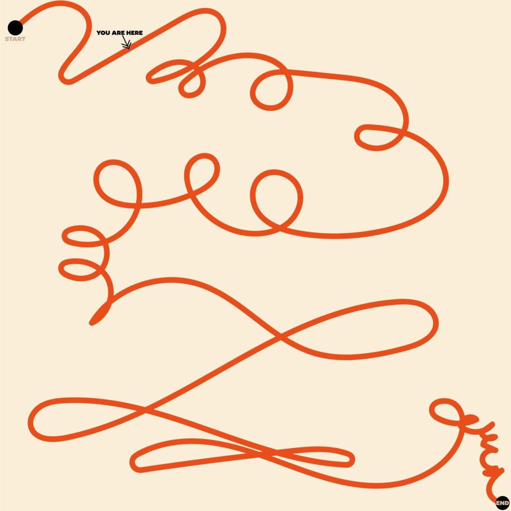 Building on the idea of a journey I decided to try and do a bit of an initial brainstorm of how that might look. When I started to think about a journey, I thought about how journeys usually have a visual representation of a map and how in cartoons show a chaotic journey of someone following a map and have this really swirly choppy and changing of directions until eventually they reach their destination. this line drawing is more a free hand let my brain switch off and just let my hand try and represent that journey I am on.