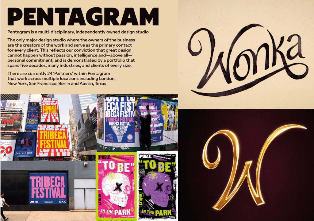 The first studio, I decided to look into was Pentagram. These a very much a staple when discussing studios. The studio is made up of ‘Partners’ within the studio. Notable ‘Partners’ include Michael Bierut and Paula Scher. I wanted to look into this studio because I felt that the work that comes out of Pentagram is so diverse, that I could see a lot of my own styles and influences coming out of it. The styles I have pulled out include: branding, typographic and illustrative work. These are all types of works that inspire my own practice.